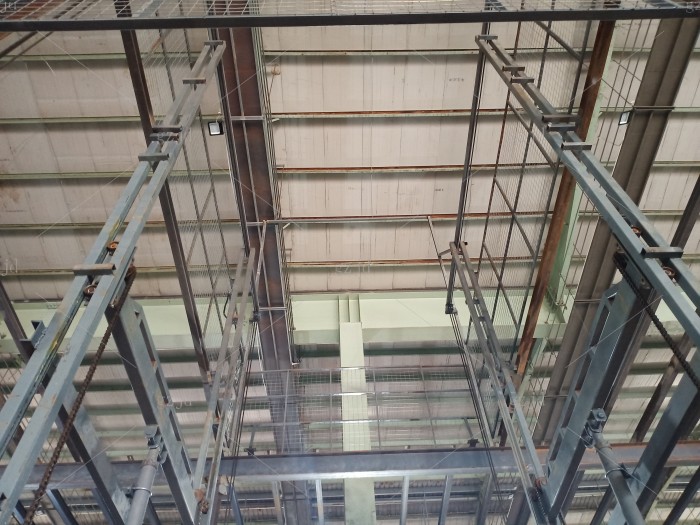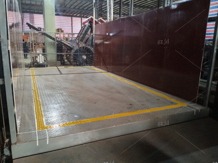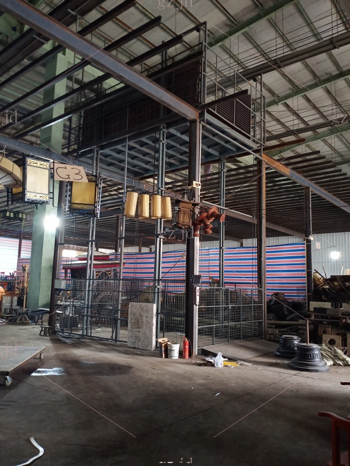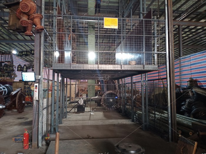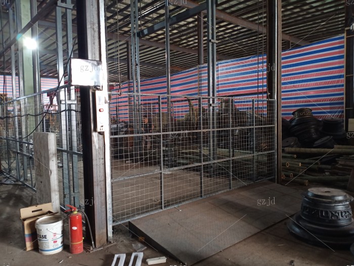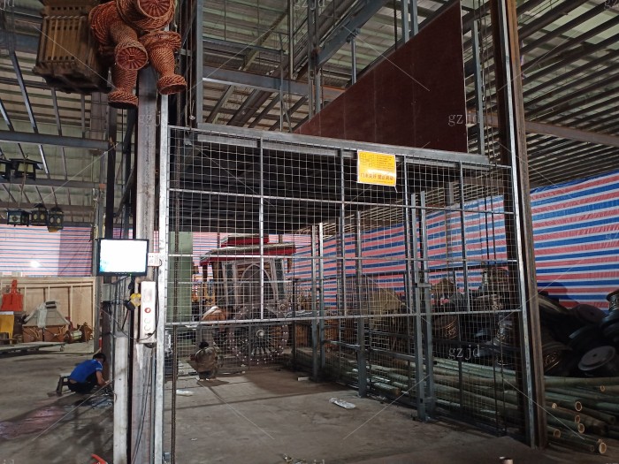 东阳横店兴业路液压货梯/升降机 老板自从2016年购买第一台以后,这里年陆续在我们这里买了一共6台,未来可期。有一次老板来到杭州找我的时候,我带他到汽车4S点里看了我们安装的样子,从价格和实用来说老板很满意,我感觉好的产品也一定要有人能看懂,彼此就信任了。 设备名称:液压升降平台 载重:3吨 提升高度:6.5米 油缸:2只Φ100液压油缸 油泵站功率:7.5kw 主链条:16B 地坑开口:宽3700mm深6000mm 平台尺寸:宽3000mm深5950mm 进货方向:宽3000mm方向进出货 地坑深度:无地坑,加斜坡一个 机房高度:无需机房 在用场所:钢结构隔层厂房 台面钢板厚度:5mm花纹防滑钢板